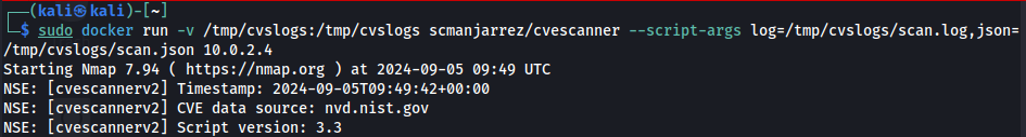 Dependency on Nmap's Accuracy CVEScannerV2 relies heavily on Nmap's service and version detection capabilities. If Nmap misidentifies a service or version, CVEScannerV2 may produce inaccurate or irrelevant vulnerability reports. False Positives The tool may flag vulnerabilities based on version information alone, without confirming their exploitability in the specific context. This can lead to overreporting of potential issues, requiring additional manual verification. Limited to Known Vulnerabilities CVEScannerV2 can only identify vulnerabilities that are already documented in its database. It may miss recently discovered issues not yet added to the CVE database. And obviously, it will not detect zero-day vulnerabilities. Resource Intensive Comprehensive scans, especially those involving extensive HTTP-based detection, can be time-consuming and resource-intensive. Step 1: Installation You can install CVEScannerV2 in two ways: using a Docker image or building from source code. The Docker image is the quickest method, so we’ll focus on that. First of all, you need to install Docker: kali> sudo apt install docker.io -y Next, pull the Docker image that includes the NVD (National Vulnerability Database) CVE database: kali> docker pull scmanjarrez/cvescanner The command to initiate the scan is as follows: kali> docker run -v /tmp/cvslogs:/tmp/cvslogs scmanjarrez/cvescanner --script-args log=/tmp/cvslogs/scan.log,json=/tmp/cvslogs/scan.json Where: -v /tmp/cvslogs:/tmp/cvslogs:*This is a volume mount. It maps the /tmp/cvslogs*directory on your host machine to the /tmp/cvslogs*directory inside the Docker container. This allows the container to write logs to a directory on your host system, making them accessible after the scan is complete. --script-args: This flag is used to pass arguments to the Nmap script (in this case, CVEScannerV2). log=/tmp/cvslogs/scan.log:*This argument specifies where to save the log file. It will be saved in the mounted volume, so it will be accessible on your host system. json=/tmp/cvslogs/scan.json: Similar to the log argument, this specifies where to save the JSON output of the scan. Step 2: Starting the Scan Now we are ready to start the scan. ![]() Once it's done, we'll get a list of the vulnerabilities found. ![]()  In addition to output to the terminal, we also have log files in the /tmp/cvslogs directory. Here is an example of a json file. And here is the log file.![]()  Once the scan is complete, we receive a visually comprehensible description of the vulnerabilities found in the system, including any known exploits. This allows us to identify and proceed with exploiting these vulnerabilities effectively.Summary CVEScannerV2 is a significant improvement in network security assessment. It combines Nmap's service detection with in-depth vulnerability analysis, giving security professionals a clear and detailed view of the network's security. In an era of constantly evolving cyber threats, tools like CVEScannerV2 are not just useful -they’re essential.